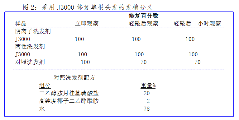 修复发梢分叉是J3000的性能之一。为了衡量对发梢分叉的修复,将带有分叉发梢的天然棕色头发逐根固定在塑料支架上,对应每种测试香波。然后,每根头发都插入装有测试配方的滴眼液瓶中洗涤。头发随后用洗瓶中的蒸馏水冲洗,重复该过程以模仿正常的洗头过 程。