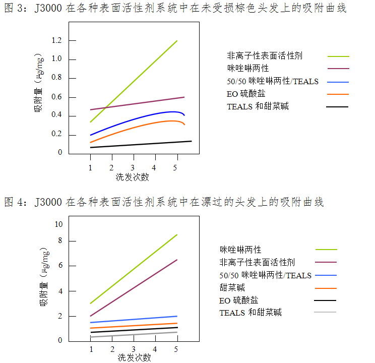 在图3和图4中给出了J3000在各种表面活性剂系统中的吸附概况。对未受损棕色和漂过的头发进行检测,以确定头发类型和发质是否对类似系统的吸附作用产生影响。