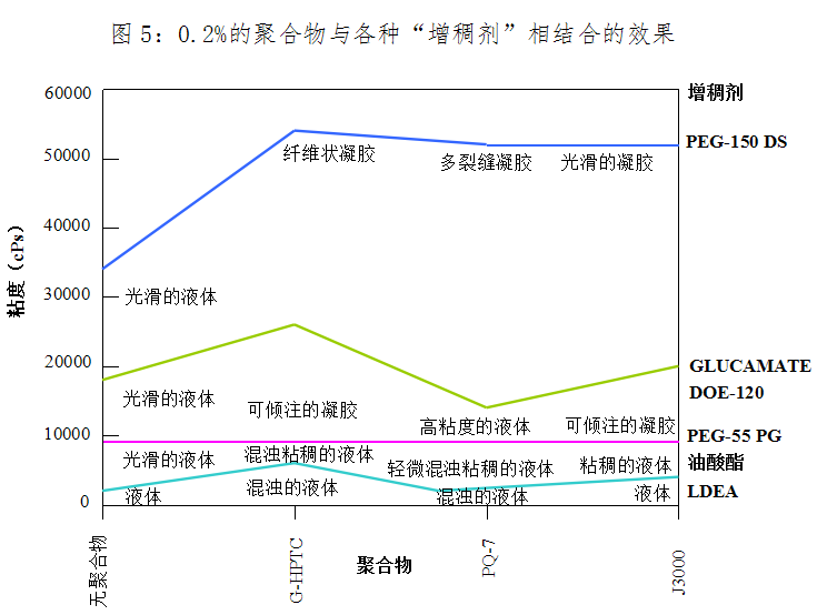 图5显示出,在PEG-150二硬脂酸酯或月桂酰胺DEA用作增稠剂的产品中,高分子量的J3000比聚季铵盐-7或阳离子瓜耳胶更能改善测试系统的外观和流变性。在PEG-55丙二醇油酸酯用作主要增稠剂的系统中,加入J3000可以产生澄清的产品,而加入聚季铵盐-7会使最终的产品有轻度混浊,加入阳离子瓜耳胶会使产品混浊。在含有1%的PEG-150二硬脂酸酯类凝胶系统中,J3000形成光滑的凝胶,聚季铵盐-7和阳离子瓜耳胶分别形成纤维状或多裂缝的凝胶。