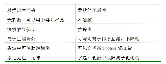 产品性能及应用 烷基糖苷衍生而来的,天然无刺激的阳离子表活剂、滋润度极佳,明显改善湿冲洗感,提高干梳性,适用于洗发水、护发素等产品, 因其极为温和,特别适用于婴儿产品中。