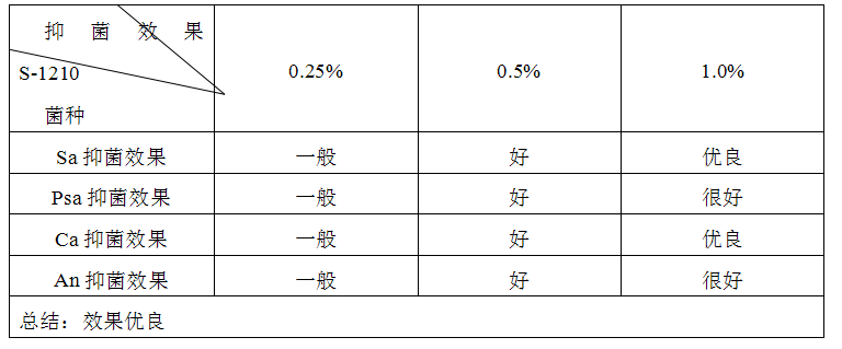 Suga Quat S-1210对四种菌有很强的抑制效果。实验表明,其杀菌抑菌效果可以达到CDM磷酸酯的抗菌效果。由于这种广泛的抗菌作用,Suga Quat S-1210可以用于自身防腐或免防腐剂的个人护理品配方体系。有关免防腐剂体系的特殊应用仍在继续进行中。