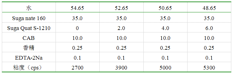 为进一步验证Suga Quat系列季氨盐对体系粘度的影响,特向洗剂配方体系中加入Suga Quat S-1210――0%,2%,4%,6%,测定成品的粘度。具体如下表: