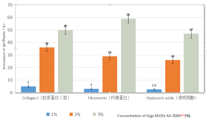 GigaPep AA-3000plus含有三/四胜肽及寡胜肽,功能性短胜肽在穿透表皮到达基底层后,可作为讯号因子,与受伤组织(皱纹凹陷处也是一种受伤组织)的细胞表面接受器结合,刺激该部位的细胞大量产生细胞外的胶原蛋白、透明质酸、弹性纤维等物质,使得受伤部位的组织回复紧实的效果,也就是从皱纹的底层让肌肤细胞再生,进而抚平皱纹。