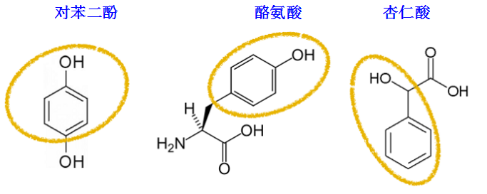 1.杏仁酸与酪氨酸具相类似结构,所以和对苯二酚一样具有抑制酪氨酸酶活性的功效。
