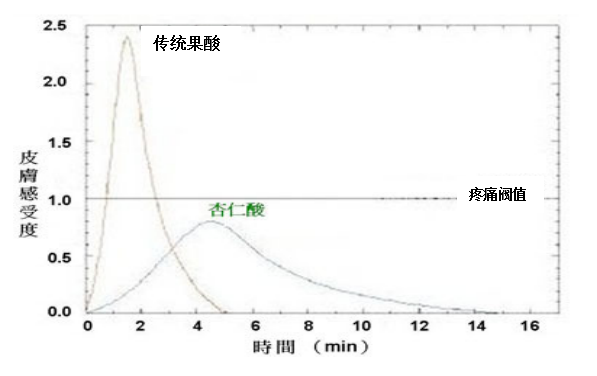 杏仁酸是目前唯一带有苯环形式的亲脂性果酸,与皮肤亲和力最高,较温和而且不刺激,是现代美白除斑的主导者。下面是杏仁酸和传统果酸多皮肤感受性的测试关系图: