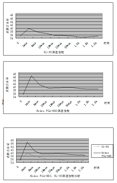 (1)Hydro PGA-H80、NL-50均能提高洗剂用品对皮肤的保水能力,但在一个小时后NL-50的保湿能力回到最初点。